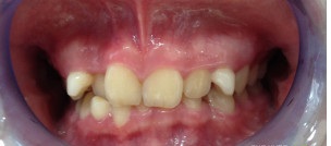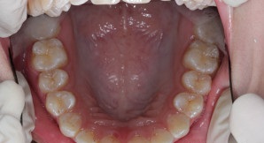 Hình trước khi chỉnh nha: răng thưa, kích thước răng to, hô khá nhiều so với khuôn mặt của bệnh nhân. Nếu chỉ đánh giá mẫu hàm và khuôn mặt của bệnh nhân tại thời điểm khám, một kế hoạch có nhổ răng là cần thiết để tạo khoảng trống kéo lùi răng để điều trị hô cho bệnh nhân. Tuy vậy, đây là một bệnh nhân trẻ em, và trẻ em sẽ có sự phát triển khuôn mặt và xương hàm đáng kể ở độ tuổi dậy thì, nên chỉ định nhổ răng có thể là không cần thiết. Vì vậy, sau khi cân nhắc nhiều yếu tố và đánh giá lợi ích – rủi ro cho bệnh nhân, bác sĩ chỉnh nha đã quyết định điều trị không nhổ răng, dựa vào sự phát triển của bệnh nhân để điều trị hô.