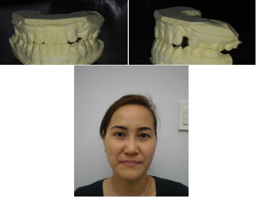 Tình trạng trước khi chỉnh nha: răng khểnh và chen chúc. Điều dễ nhận thấy qua mẫu hàm là sẽ không thể nào đủ khoảng trống để sắp xếp đều răng, vì vậy có khả năng cần nhổ răng. Tuy nhiên, bác sĩ không chỉ đánh giá qua mẫu hàm, mà còn nhiều yếu tố khác như độ tuổi, tiềm năng phát triển của khuôn mặt và xương hàm,v.v… nên đã đưa ra kế hoạch điều trị không nhổ răng để thăm dò, nếu kết quả không tốt thì mới nhổ răng.
