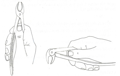 Cán kìm được đặt trong lòng bàn tay phải. Đặt ngón cái vào giữa hai cán kìm phòng việc bóp cán kìm quá nhanh làm nát vỡ thân răng. Bốn ngón còn lại được giữ dưới hai cán kìm và gần cuối cán để có thể mở ra khi cần thiết (mở kìm bằng ngón út và ngón nhẫn).