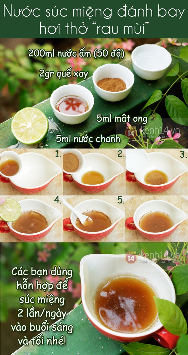 - Chanh và quế giúp tiêu diệt các vi khuẩn trong miệng, nguyên nhân gây nên hôi miệng. Bên cạnh đó mật ong không chỉ ngăn ngừa sự xuất hiện trở lại của chúng mà còn làm cho nước súc miệng có vị ngon hơn.